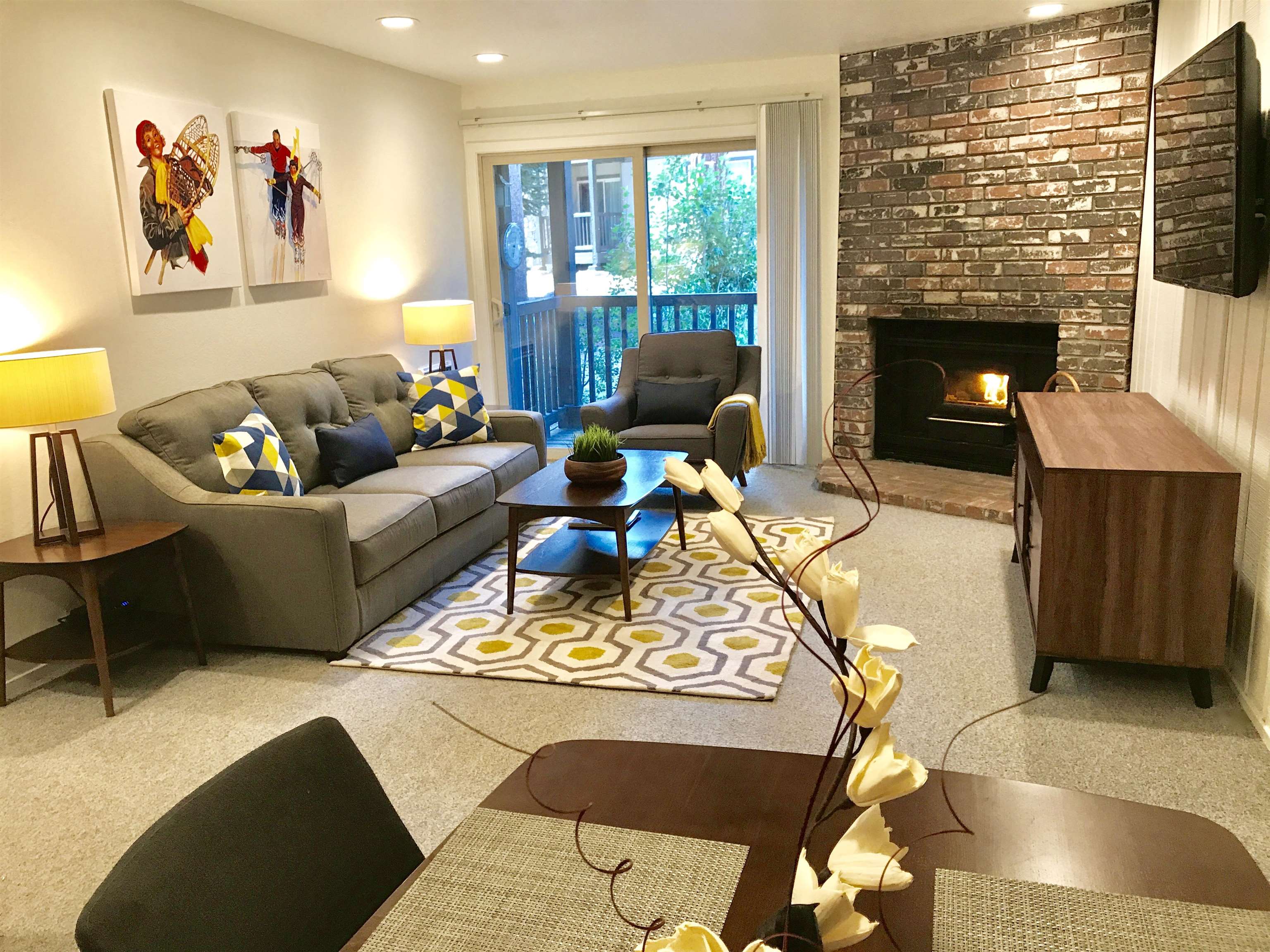 So close to Canyon Lodge! No need to drive to the slopes or take the bus, you are already at the base of the mountain! This lovely 1-bedroom unit has a fully equipped updated bathroom complete with a rain shower. The living room features a brick wood burning fireplace with TV. The bedroom has a Cal-King bed with 42" TV. Enjoy the fresh outdoors and serenity on the outdoor balcony. The common area across the parking area has two spas, pool, sauna, recreation room, laundry facilities and business center. With less than a 5 min walk to Canyon Lodge, come home to enjoy this beautiful first floor condo with all the comforts of home and more! Buyer to be responsible for woodstove compliance. Airbnb Revenue reported by seller to $76,800 in 2024, $79,836 for 2023, and $76,440 for 2022. Cable & internet is charged through the HOA at $45/month (as of May 2025)