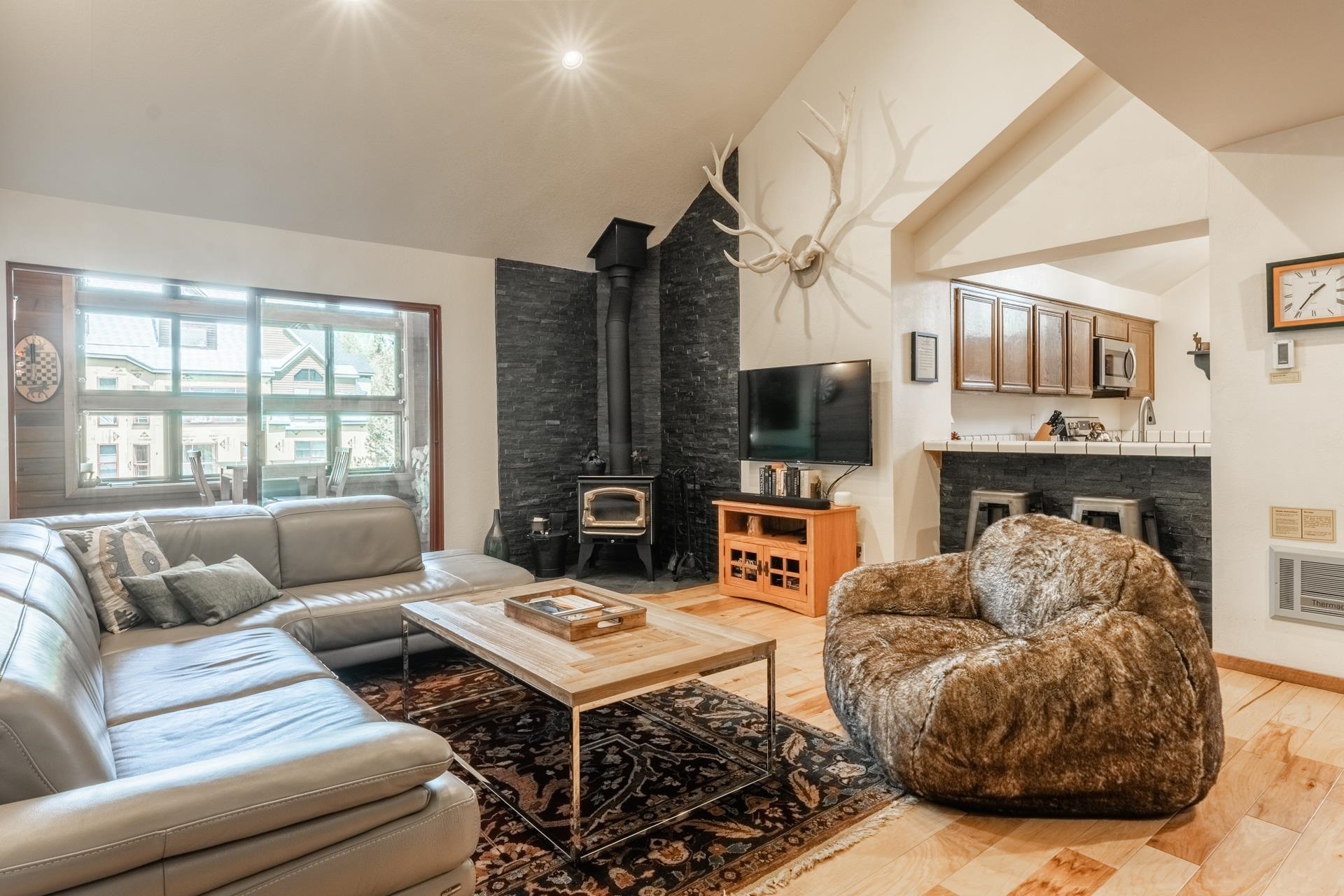 Welcome to this beautifully updated and fully furnished top-floor condo in Aspen Creek--ideally situated near Eagle Lodge for easy access to the slopes of Mammoth Mountain. This one-bedroom, one-bath retreat features soaring vaulted ceilings, creating a bright and airy ambiance throughout. Thoughtfully maintained and move-in ready, the unit includes stylish hickory and tile flooring, newer kitchen appliances, and a cozy EPA-compliant wood stove set on a stone and tile hearth. A clever Murphy bed in the dining area adds functionality without sacrificing space, and a spacious mudroom offers ample storage for your gear after a day of mountain adventures. The condo comes furnished (excluding select personal artwork) and is equipped with keyless entry for added convenience. Aspen Creek offer...